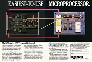 The Signetics 2650 was an 8-bit microprocessor introduced in July 1975.[1] According to Adam Osborne's book An Introduction to Microprocessors Vol 2: Some Real Products, it was "the most minicomputer-like" of the microprocessors available at the time. A combination of missing features and odd memory access limited its appeal, and the system saw little use in the market.