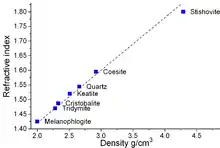 Alpha quartz is the most stable form of solid SiO2 at room temperature. The high-temperature minerals, cristobalite and tridymite, have both lower densities and indices of refraction than quartz. The transformation from α-quartz to beta-quartz takes place abruptly at 573 °C. Since the transformation is accompanied by a significant change in volume, it can easily induce fracturing of ceramics or rocks passing through this temperature limit.[13] The high-pressure minerals, seifertite, stishovite, and coesite, though, have higher densities and indices of refraction than quartz.[14] Stishovite has a rutile-like structure where silicon is 6-coordinate. The density of stishovite is 4.287 g/cm3, which compares to α-quartz, the densest of the low-pressure forms, which has a density of 2.648 g/cm3.[15] The difference in density can be ascribed to the increase in coordination as the six shortest Si–O bond lengths in stishovite (four Si–O bond lengths of 176 pm and two others of 181 pm) are greater than the Si–O bond length (161 pm) in α-quartz.[16] The change in the coordination increases the ionicity of the Si–O bond.[17] More importantly, any deviations from these standard parameters constitute microstructural differences or variations, which represent an approach to an amorphous, vitreous, or glassy solid.
