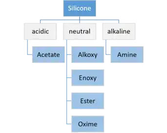 Condensation curing systems can be one-part or two-part systems.[3] In one-part or RTV (room-temperature vulcanizing) system, a cross-linker exposed to ambient humidity (i.e., water) experiences a hydrolysis step and is left with a hydroxyl or silanol group. The silanol condenses further with another hydrolyzable group on the polymer or cross-linker and continues until the system is fully cured. Such a system will cure on its own at room temperature and (unlike the platinum-based addition cure system) is not easily inhibited by contact with other chemicals, though the process may be affected by contact with some plastics or metals and may not take place at all if placed in contact with already-cured silicone compounds. The crosslinkers used in condensation cure systems are typically alkoxy, acetoxy, ester, enoxy or oxime silanes such as methyl trimethoxy silane for alkoxy-curing systems and methyl triacetoxysilane for acetoxy-curing systems. In many cases an additional condensation catalyst is added to fully cure the RTV system and achieve a tack-free surface. Organotitanate catalysts such as tetraalkoxy titanates or chelated titanates are used in alkoxy-cured systems. Tin catalysts such as dibutyl tin dilaurate (DBTDL) can be used in oxime and acetoxy-cured systems. Acetoxy tin condensation is one of the oldest cure chemistries used for curing silicone rubber, and is the one used in household bathroom caulk. Depending on the type of detached molecule, it is possible to classify silicone systems as acidic, neutral or alkaline.[4]