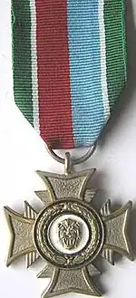 The medal was a sterling silver cross with an enamelled roundel in the centre bearing a lion's head, suspended from a ribbon woven half-red and half blue, with green edges and narrow white stripes at the inner edge of the green