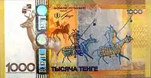 The Silver Deer of Bilge Khan is depicted on a KZT 1,000 tenge banknote, issued by the Kazakh government.[27] The issue of the commemorative banknote was confirmed by the Kazakh government on December 12, 2013.[27] The banknote was dedicated to the Second Turkic Khaganate on both sides, with the Silver Deer on one side, and the Bust of Kul Tigin on the other. About 10 million banknotes were put in circulation by the National Bank of Kazakhstan.[27][28]