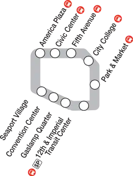 | Character | Unidirectional clockwise at-grade loop around Downtown San Diego | ||||||||||||||||||||||||||||||||||||||||||||||||||||||||||||||||||||||||||||||||||||||||||||||||||||||||||||||||||||||||||||||||||||||||||||||||||||||||||||||||||