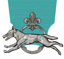 The Silver Wolf (Swedish: Silvervargen) is the highest award made by Swedish Scouting, to active leaders at the national level for exceptionally meritorious work. The award consists of a stylized silver wolf with a fleur-de-lis with the words "Scouterna", suspended from a turquoise neck ribbon. The Silver Wolf will be distributed by someone who already holds the award.