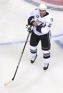 After just one season in Tampa Bay, Gagné became an unrestricted free agent. On July 2, 2011, he signed a two-year, $7 million contract with the Los Angeles Kings.[11] He scored his first goal as a Kings player on October 13, 2011, against Martin Brodeur of the New Jersey Devils. During the regular season, he appeared in 34 games and scored 10 goals with 17 points overall. On June 11, 2012, he won the Stanley Cup over the Devils, along with former Flyers teammates Jeff Carter and Mike Richards. During the Kings' playoff run, he appeared in four games but did not record a point. During the off-season, he underwent surgery to remove a 5 cm mass from his neck which had been causing him chronic pain.[12]