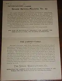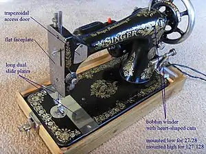 The Singer Model 27 and later model 127 were a series of lockstitch sewing machines produced by the Singer Manufacturing Company from the 1880s to the 1960s. (The 27 and the 127 were full-size versions of the Singer 28 and later model 128 which were three-quarters size). They were Singer's first sewing machines to make use of "vibrating shuttle" technology. Millions were produced.[lower-alpha 1] They are all steel and cast iron, and were built before the advent of planned obsolescence, and so they were designed to be repaired rather than replaced.[lower-alpha 2] Consequently many remain today, some in collections and others still in service. In company literature they were called "the woman's faithful friend the world over".[2]
