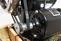 The add-on motor drives the handwheel by means of a rubber belt. Meanwhile the bobbin winder has a separate belt: the models 27 and 28 drive the bobbin winder using a long round or V belt to the motor, whereas the 'modernized' models 127 and 128 drive the bobbin winder directly off the handwheel by means of a small "ring belt" or "bobbin belt" acting as a tire.