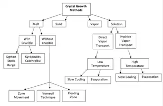 Basic crystal growth methods can be separated into four categories based on what they are artificially grown from: melt, solid, vapor, and solution.[2] Specific techniques to produce large single crystals (aka boules) include the Czochralski process (CZ), Floating zone (or Zone Movement), and the Bridgman technique. Dr. Teal and Dr. Little of Bell Telephone Laboratories were the first to use the Czochralski method to create Ge and Si single crystals.[8] Other methods of crystallization may be used, depending on the physical properties of the substance, including hydrothermal synthesis, sublimation, or simply solvent-based crystallization.[9] For example, a modified Kyropoulos method can be used to grow high quality 300 kg sapphire single crystals.[10] The Verneuil method, also called the flame-fusion method, was used in the early 1900s to make rubies before CZ.[7] The diagram on the right illustrates most of the conventional methods. There have been new breakthroughs such as chemical vapor depositions (CVD) along with different variations and tweaks to the existing methods. These are not shown in the diagram.