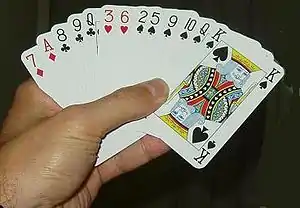 In contract bridge, a single suiter (or single-suited hand) is a hand containing at least six cards in one suit and with all other suits being at least two cards shorter than this longest suit. Many hand patterns can be classified as single suiters. Typical examples are 6-3-2-2, 6-3-3-1 and 7-3-2-1 distribution.