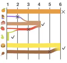 Step 4: Of the remaining options, Strawberry and Chicken now are tied for the least votes. The tie is broken by seeing that Chicken had more first preference votes. Strawberry is eliminated. In accordance to the next preference marked on the vote cast by the voter who voted Strawberry as first preference, that vote is transferred to Orange. In accordance to the next preference marked on the two votes cast by the Pear–Strawberry–Cake voters (which had been transferred to Strawberry in step 2), the two votes are transferred to Cake. (The Cake preference had been "piggy-backed" along with the transfer to Strawberry.) Cake reaches the quota and is elected.