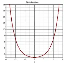 In mathematics, the sinhc function appears frequently in papers about optical scattering,[1] Heisenberg spacetime[2] and hyperbolic geometry.[3] For , it is defined as[4][5]