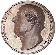 Fighting against France, Duckworth distinguished himself both in European waters and in the Caribbean. He was initially in command of the 74-gun HMS Orion from 1793 and served in the Channel Fleet under Admiral Lord Howe. He was in action at the Glorious First of June.[3] Duckworth was one of few commanders specifically mentioned by Howe for their good conduct, and one of eighteen commanders honoured with the Naval Gold Medal, and the thanks of both Houses of Parliament.[3]