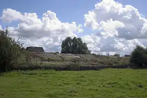 The Allies spotted the construction of the Siracourt bunker almost as soon as it began in September 1943, when two parallel trenches were dug and concreted to form the walls of the structure.[2] Heavy Allied bombing hindered construction but it continued until the end of June 1944, when the site was wrecked by Tallboy bombs dropped by the Royal Air Force. By this time about 90 per cent of the concrete had been completed, apart from the end sections, but the supposedly bomb-proof structure proved unable to withstand the six-ton Tallboy. One bomb fully penetrated the roof and exploded underneath, while another caused substantial damage when it exploded next to one of the walls. The ground around the site was churned up by over 5,000 tons of bombs.[1] By the time the site was abandoned in April 1944, the exterior had practically been completed but the excavation of the interior had only just begun.[2] Roland Hautefeuille estimated that Siracourt was the most heavily bombed military target in all of Europe with 5,070 tons of bombs directed at it.[5] These bombs considerably change the terrain around the site, destroying most of the village of Siracourt. After the war, the authorities quickly abandoned the idea of demolishing the bunker. Before the land was leveled, 80 German prisoners of war removed the launching ramp facing England and partially filled in the interior of the bunker.[6]