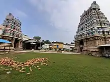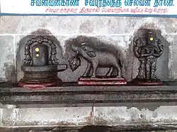 The present temple in the village dates back to the Later Chola period and covers an area of 1.3 acres (5,300 m2).[4] The principal shrine is dedicated to Shiva who is worshipped by a sculpted figurine of Vishnu in his Varaha Avatar.[4] There are also shrines dedicated to Subrahmanya, Gajalakshmi and Bhairava.[4]