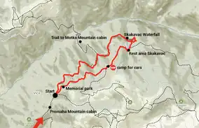 The main tourist attraction of the park - Skakavac waterfall - can be reached by trail.[7] The trailhead is accessible by bus or car and by foot.[8] Visitors can travel to the waterfall trailhead from Nahorevo or hike from Sarajevo through Nahorevo and the Skakavac Nature Preserve.[7] The waterfall may also be reached by vehicle, with rest areas available along the trail.