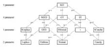 Special and limiting cases of the skewed generalized t distribution include the skewed generalized error distribution, the generalized t distribution introduced by McDonald and Newey,[6] the skewed t proposed by Hansen,[8] the skewed Laplace distribution, the generalized error distribution (also known as the generalized normal distribution), a skewed normal distribution, the student t distribution, the skewed Cauchy distribution, the Laplace distribution, the uniform distribution, the normal distribution, and the Cauchy distribution. The graphic below, adapted from Hansen, McDonald, and Newey,[2] shows which parameters should be set to obtain some of the different special values of the skewed generalized t distribution.