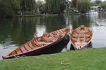 Thames skiffs were developed in the 19th century primarily for leisure use by private individuals sculling themselves. The design was based on the Thames wherries and shallops that were operated by watermen as a water taxi service in London. By the late 19th century, when Jerome K. Jerome wrote of his up-river expedition in Three Men in a Boat,[1] there were thousands of skiffs at places like Richmond, Kingston and Oxford. However, there are references to skiffs (as a result of accidents) as early as 1812[2] and 1824 at Oxford.[3] In August 1815, the poet Percy Bysshe Shelley was taken on a skiffing expedition from Old Windsor to Lechlade by Charles Clairmont and Thomas Love Peacock.[4] He subsequently settled at Marlow where he regularly skiffed through the locks.[5]