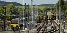 Originally there was a fan of three sidings just west of Skipton Station with a carriage washer before the sidings split off from the connecting line.[3] This was changed to four sidings (with a full Controlled Emission Toilet (CET) discharge line) in 2012 after services had been strengthened on the Airedale Line.[4] Class 322 EMUs were transferred from Scotrail to bolster peak time services in the Aire Valley.[5] This resulted in a £3.6 million improvement in the siding space to allow overnight stabling of 14 units.[6]