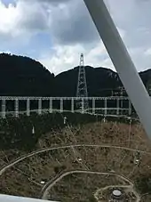 It has a novel design, using an active surface made of 4,500 metal panels which form a moving parabola shape in real time.[5] The cabin containing the feed antenna, suspended on cables above the dish, can move automatically by using winches to steer the instrument to receive signals from different directions. It observes at wavelengths of 10 cm to 4.3 m.[6][7]