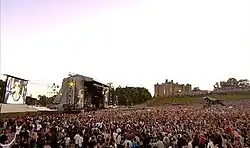 The Slane Festival (often referred to as Slane) is a recurring concert held most years since 1981 on the grounds of Slane Castle on the outskirts of Slane in County Meath, Ireland. The castle is owned by The 8th Marquess Conyngham, who was known by the courtesy title the Earl of Mount Charles from 1974 until 2009. Slane lies between Navan and Drogheda, about 45 km northwest of Dublin. Concerts typically occur on a Saturday in August, from 12:00 to 22:00. The sloping grounds of Slane Castle form a natural amphitheatre which is ideal for concerts.[1] As many as 70,000–110,000 people usually attend. One of the venue boundaries is the River Boyne. Two people died while trying to swim the river to gain free access to R.E.M.'s concert in 1995.[2][3] The minimum age of admission to the Slane Festival was reduced in 2006 from 18 to 16 because of complaints.
