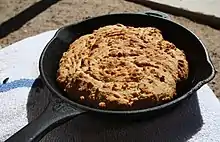 Enslaved people's diet was determined by what food was given to them, the mainstays being corn and pork.[38][67] At hog butchering time, the best cuts of meat were kept for the master's household and the remainder, such as fatback, snouts, ears, neck bones, feet, and intestines (chitterlings) were given to the slaves. Cornbread was commonly eaten by enslaved people, and there were many other ways that corn was prepared, such as porridge, hominy, grits, corn cakes, waffles, and corn dodgers.[68] Enslaved adults were typically given a peck (9 liters) of cornmeal and 3–4 pounds (1.5–2 kilos) of pork per week, and from those rations come soul food staples such as cornbread, fried catfish, chitterlings, and neckbones.[69]
