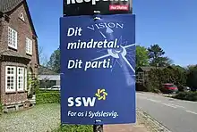 The South Schleswig Voters' Association[nb 1] (German: Südschleswigscher Wählerverband; SSW, Danish: Sydslesvigsk Vælgerforening; SSV) is a regionalist political party in Schleswig-Holstein in northern Germany. The party represents the Danish and Frisian minorities of the state.[3][4]