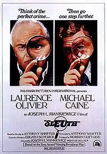 Sleuth is a 1972 mystery thriller film directed by Joseph L. Mankiewicz and starring Laurence Olivier and Michael Caine. The screenplay by playwright Anthony Shaffer was based on his 1970 Tony Award-winning play. Both Olivier and Caine were nominated for Academy Awards for their performances. This was Mankiewicz's final film. Critics gave the film overwhelmingly positive reviews.[5]