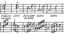 Henry Purcell (1696), Jacques Champion de Chambonnières (1670) and Jean-Henri d'Anglebert (1689) use the French word coulé. D'Anglebert in particular shows how the slide can fill in the intervals of a major third and a perfect fourth. Jean Rousseau (1687) called the figure a plainte.[4]