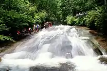 The area has been developed by the US Forest Service into a popular recreation area. The area is currently being managed by a company called Adventure Pisgah (formerly known as Pisgah Hospitality Partners) which provides staffing for Sliding Rock as well as numerous other recreational sites and campgrounds in the region. Parking is available in a large lot above the rock and beside U.S. Highway 276. When the lot is full during busy summer hours, staff will temporarily close the parking lot and direct traffic away while visitors must wait for the lot to reopen. There is one viewing platform (the second, lower platform was destroyed by a rain storm and subsequent flooding of the river in summer of 2021). There are steps down to the pool and a railing to help climb the rock on the left side before sliding down. Sliding down is allowed in an upright sitting position only.[1] Visitors may only slide if they are able to swim and tread water, because the pool at the bottom of the slide is 8 feet deep. Non-swimmers are required to wear Coast Guard-approved floatation devices in order to slide. Pool noodles, inner tubes, inflatable water wings, and other non-Coast Guard-approved floats are not to be used. A restroom and changing room is provided during staffed hours, and a staff of lifeguards are periodically on duty: Sliding Rock is staffed full-time especially throughout the busiest part of summer, and on weekends early and late in the summer season. At other times, sliding down the waterfall is done at a visitor's own risk. Children must be of a certain age to slide alone, otherwise, they may slide with the assistance of a competent adult.
