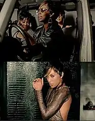 Hilson alongside Monica in a Jeep riding to a party, and her featured in front of a leather wall.