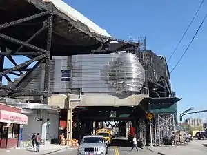 In 2007, the MTA announced a three-year, $257.5 million renovation project of the elevated Culver Viaduct, and that for twenty-seven months, this station would be fully or partially closed for a $32 million renovation.[22][23][24][25] The renovation was necessitated because the viaduct was falling apart, with leaks and broken concrete riddling it. The station and the portions of the viaduct near the station had to be encased in a mesh wrapping because there was a significant danger of concrete falling from the viaduct.[26]