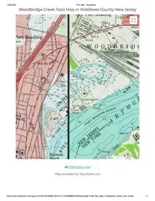 Smith Creek is a stream in Woodbridge Township, New Jersey, United States,[1] emptying into the Arthur Kill 0.5 miles (0.80 km) north of the Woodbridge River.[2] It was named for John Smith, one of the group who in 1667 purchased the land parcel from Governor Philip Carteret that became Woodbridge.[3] Its navigable length is 0.6 miles (0.97 km), and there are nine marinas in that stretch. The creek draws less than 3 to 3.5 feet (0.91 to 1.07 m) of water, limiting its use to shallow draft boats.[4] Dredging of the creek in the region of the marinas was a 2013 priority for Woodbridge Township after Hurricane Sandy.[5] The creek is a "minor freshwater tributary" to Arthur Kill, with higher flows in the spring, and less in late summer and fall.[6] Public Service Enterprise Group has a generating station 0.6 miles (0.97 km) north of the mouth of Smith Creek.[7] One mile north of the mouth is an oil refining and storage facility. In 2013 "corrective action" was taken against the Hess Corporation, after selling the property, for soil and groundwater contamination, including arsenic, lead and benzene.[8] An old reference states: