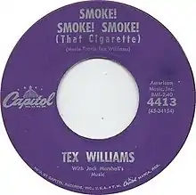 "Smoke! Smoke! Smoke! (That Cigarette)" is a Western swing novelty song written by Merle Travis and Tex Williams,[3] for Williams and his talking blues style of singing. Travis wrote the bulk of the song.[4] The original Williams version went to number one for 16 non-consecutive weeks on the Hot Country Songs chart and became a #1 hit in August 1947 and remained at the top of the "Best Sellers in Stores" chart for six weeks.[5] It was written in 1947[6] and recorded on March 27, 1947, at Radio Recorders in Hollywood.[2]