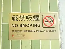 In 2015 there were 641,300 daily smokers (of which 538,300 or 83.9 per cent were male and 103,000 or 16.1 per cent female).[2] Approximately 19 per cent of Hong Kong males smoke whereas in China 53 per cent of males smoke.[3][4]