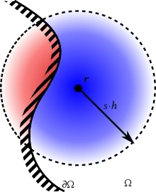 In case the SPH convolution shall be practiced close to a boundary, i.e. closer than s · h, then the integral support is truncated. Indeed, when the convolution is affected by a boundary, the convolution shall be split in 2 integrals,