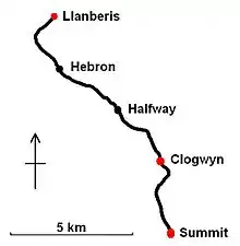 | Llanberis | 53°06′59″N 4°07′10″W / 53.1163°N 4.1195°W | 353 ft (108 m) | Has two platforms. The first stretch of line is uphill at 1 in 50, steep for a main line but shallow compared with the 1 in 6 incline that begins shortly afterwards. |
