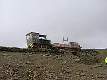 In 2006 the Snowdon summit cafe was demolished and construction of a new visitor centre was started. While this construction was taking place passenger trains terminated at Clogwyn, but the line and a works train was still used to transport workers and materials to the project. On some days, however, the train could not reach the summit and the workers had to walk down to Rocky Valley.[22] The new building, Hafod Eryri (loosely translated from Welsh as "high summer residence of Snowdonia"),[23] was officially opened by First Minister Rhodri Morgan on 12 June 2009.[22]