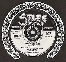 In the summer of 1976, Riviera borrowed £400 from Dr. Feelgood's Lee Brilleaux and rock photographer Keith Morris and along with former Brinsley Schwarz manager Dave Robinson formed Stiff Records.[3] Stiff gave Lowe £45 to record two songs and accompanied only by drummer Steve Goulding of The Rumour recorded "So It Goes" and the B-side, “Heart of the City”.[4] The single was released on 14 August 1976 with the catalogue number Stiff BUY1. The single was marketed through specialist shops and by mail order.[4] Although it failed to chart, it more than recouped its investment and helped kick-start a new generation of DIY independent labels.[3]