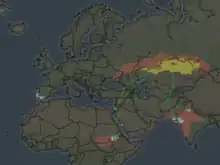 The estimated population count was enhanced following decades long studies and, in October 2007, a superflock of approximately 3,200 sociable lapwings were discovered in Turkey, according to Guven Eken, director of the Turkish Nature Association.[11] Additionally, 1500 sociable lapwings were found overwintering in Syria.[12] The population is currently estimated to sit at 17 thousand individuals, and there was a reported increase in nests each year leading up to 2007, however it is difficult to determine whether this was an increase or simply more nests being found as a result of intensified fieldwork.[10] The range of the sociable lapwing has heavily contracted as it has once existed from Ukraine to China.