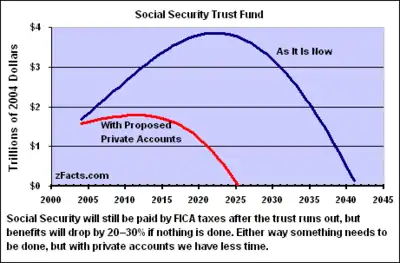 - February 2005 – Republican President George W. Bush outlined a major initiative to reform Social Security which included partial privatization of the system, personal Social Security accounts, and options to permit Americans to divert a portion of their Social Security tax (FICA) into secured investments. In his 2005 State of the Union Address, Bush discussed the potential bankruptcy of the program. Democrats opposed the proposal.[59] Bush campaigned for the initiative in a 60-day national tour.[60] However, public support for the proposal only declined.[61] The House Republican leadership tabled Social Security reform for the remainder of the session.[62] In the 2006 midterm elections, Democrats gained control of both houses, effectively killing the plan for the remainder of Bush's term in office.