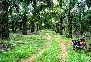Oil palms produce 38% of the world's vegetable-oil output on 5% of the world's vegetable-oil farmland.[1] Palm oil plantations, typically monoculture crops are under increasing scrutiny for their effects on the environment, including loss of carbon-sequestering, biodiverse forest land.[2] There is also concern over displacement and disruption of human and animal populations due to palm oil cultivation.[3][4]
