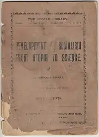 The first American edition of the work was published by the Socialist Labor Party of America (SLP) in 1895 as part of its "People's Library," featuring a new translation by Daniel DeLeon. A new title was employed by DeLeon, Development of Socialism from Utopia to Science.[7] The SLP edition was first reissued in February 1900 and reissued again at various subsequent dates.