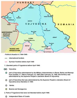 The Autonomous Province of Vojvodina (Serbo-Croatian: Autonomna Pokrajina Vojvodina / Аутономна Покрајина Војводина) was formed in 1945, as an autonomous province within the People's Republic of Serbia, a federal unit of the Federal People's Republic of Yugoslavia.[3]