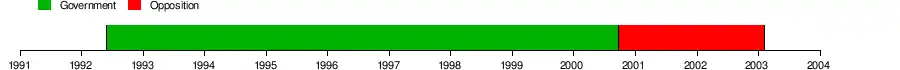 After the announcement that SPS would abandon its hardline position regarding the Bosnian War and Croatian War of Independence in favour of a compromise and after a dispute regarding the rebalancing of the federal budget in July 1993, the coalition between SPS and SRS was disintegrated.[17]:100 SRS then unsuccessfully called a motion of no confidence against SPS in September 1993, though Milošević ended up dissolving the National Assembly to call a snap parliamentary election for December 1993.[17]:102[29] In the parliamentary election, SPS won 123 seats, though still short 3 seats of a majority, Milošević then persuaded the New Democracy (ND), which as part of the SPO-led Democratic Movement of Serbia coalition won 5 seats, to enter a coalition government with SPS.[29][30] ND accepted this and the new government headed by Mirko Marjanović was sworn in March 1994.[29][30]