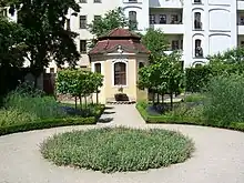 In 1777, with the assistance of the publisher Conrad Georg Walter, the theatre moved to a larger building in Borngasse (near the current location of the German Hygiene Museum), but after Walter's death the following year, it moved again on 7 December 1779 to its current home, a garden building in the courtyard behind the residence of the government secretary Johann Christoph Hoffmann at Hauptstraße 19.[5] This had been built in 1740 in Baroque style, intended for masquerades, but never used. It accommodated an audience of 250 and a 24-piece orchestra.[6] The 6 by 5 metres (20 ft × 16 ft) stage was small even then; it was illuminated with wax or tallow candles in special holders designed to reflect the light on the desired spot.[3] The interior was by Johann Ludwig Giesel, who also designed the interior of the original Gewandhaus in Leipzig. The design for the curtain in 1779 was by Johann Eleazar Zeissig, known as Schenau, a director of the Dresden Academy of Fine Arts; it depicted, amongst genii and garlands of roses, scenes from Greek mythology, such as Thalia, the muse of comedy, showing a youth the way to the temple of virtue while a bacchante tried to draw him towards the temple of lust.[6]