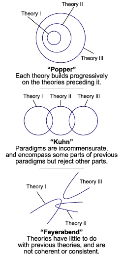 Three models of change in scientific theories, depicted graphically to reflect roughly the different views associated with Karl Popper, Thomas Kuhn, and Paul Feyerabend