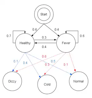 The doctor believes that the health condition of the patients operates as a discrete Markov chain. There are two states, "Healthy" and "Fever", but the doctor cannot observe them directly; they are hidden from the doctor. On each day, there is a certain chance that a patient will tell the doctor "I feel normal", "I feel cold", or "I feel dizzy", depending on the patient's health condition.