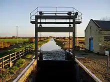 In 1875, the Drainage Commissioners spent £294 (equivalent to £29,466 in 2021) on a flash lock, which had a flagstone floor, a chamber constructed of white bricks, a timber guillotine gate, and a mechanism for raising the gate made from cast-iron, supported by a timber frame. The chamber was 11.75 feet (3.58 m) wide, and the mechanism included a winding drum with winding wheel, and cogwheels with ratchets. The timber frame was demolished in 1968[6] but the chamber still survives, some 1,010 yards (920 m) upstream from the entrance gates.