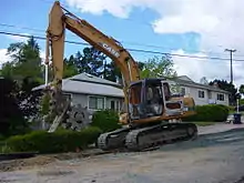 A [[> 10 tonne excavator]] is here equipped with a narrow sheepsfoot roller to compact the fill over newly placed sewer pipe, forming a stable support for a new road surface.