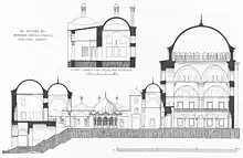 The mosque is noted for its architecturally challenging location on a steep slope. Sinan resolved this issue by fronting the mosque with a two-storey courtyard. The bottom storey was divided into shops, whose rents were intended to help support the upkeep of the mosque. The upper storey with an open colonnaded courtyard had the spaces between the columns on three sides walled off to form small rooms, each with a small window, fireplace and niche to store bedding, forming the living accommodations for a madrasah. The fourth side of the courtyard is the mosque itself, which is designed as a hexagon inscribed in a rectangle, topped by a dome with four small semi-domes in the corners.[3] The dome is 13 metres (43 ft) in diameter and 22.8 metres (75 ft) high.[4] The ablution fountain in the courtyard has twelve columns supporting an onion shaped dome.[5] The single minaret is placed at the northeast corner of the mosque.[6]