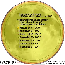 The Sun's distance from Earth is about 400 times the Moon's distance, and the Sun's diameter is about 400 times the Moon's diameter. Because these ratios are approximately the same, the Sun and the Moon as seen from Earth appear to be approximately the same size: about 0.5 degree of arc in angular measure.[9]